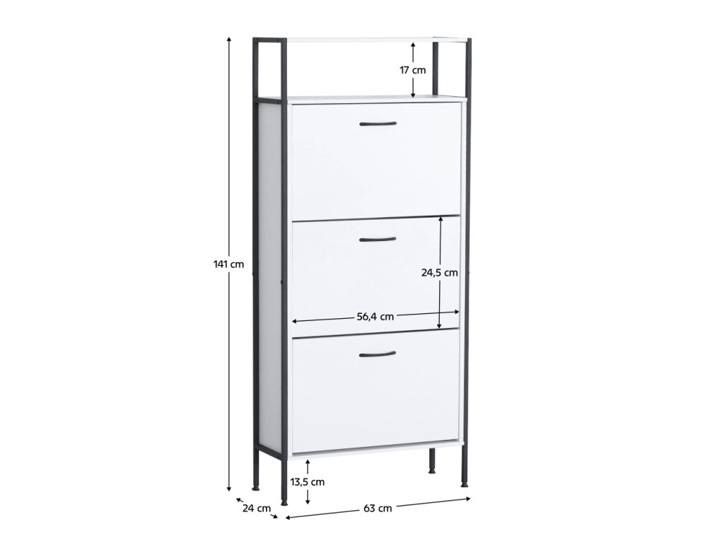 Materiál: dřevotříska/ocel/plast Barva: bílá/černá Rozměry (ŠxHxV): 63x24x141 cm Tloušťka materiálu: 1,2-1,5 cm Výška spodního prostoru od podlahy: 13,5 cm Na nožičkách Tři výklopné šuplíky Šuplík rozdělený na 2 části Prostor mezi šulíky: 9 cm Rozměry výklopného šuplíku (ŠxV): 56,4x34,5 cm Nosnost výklopného šuplíku: 6 kg Police Nosnost vrchní desky: 10 kg Moderní design Praktický Dodáváno v demontuBalení (počet kusů : 1)