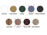 Materiál frontů a dvířek: laminovaná MDF, ABS hrany 2mm. Z vnitřní strany jsou dvířka potaženy bílým laminátem a z vnější strany je fólie v matné barvě.