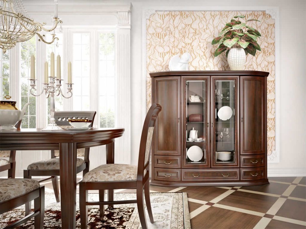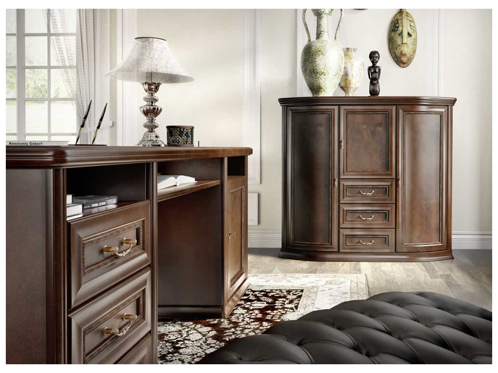 Sestava HOLGER navržena v nadčasovém a extrémně elegantním klasickém stylu. Polokruhová přední linie zdobená velkolepými úchyty a propracovanými detaily přitahuje pozornost. Kolekce působí přírodně a je vyhotovena z velmi odolných materiálů. Nábytek se vyrábí z velmi kvalitních materiálů proto je určena i pro nejnáročnější uživatele. Sestava je vhodná do obývacího pokoje, jídelny, ložnice i kanceláře.