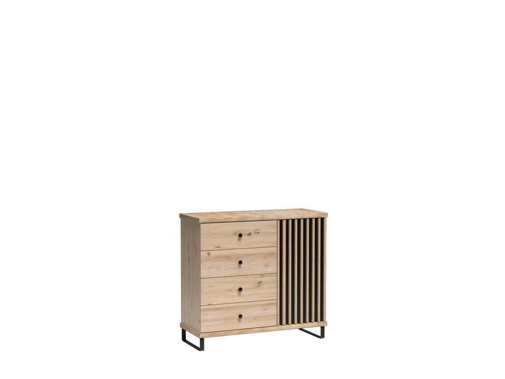 Komoda CALI má 1 dvířka a 4 zásuvky.
