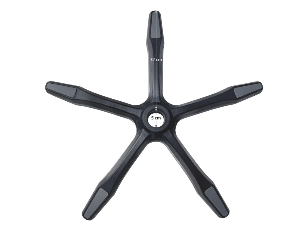 Materiál: nylonový plast Barva: černá/šedá 5-ramenná Délka ramene: 32 cm Průměr otvoru na píst: 5 cm Pro kolečka o průměru vřetena: 1,1 cm Výška: 9 cm Nosnost: 150 kg Pro kancelářská křesla Pro kancelářské židleBalení (počet kusů : 1)